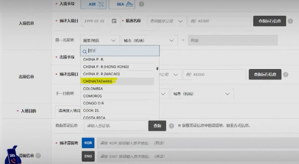 한국 전자입국신고서(E-Arrival Card)의 ‘중국(타이완)’ 표기를 둘러싸고 타이완 정치권 강력한 유감표시