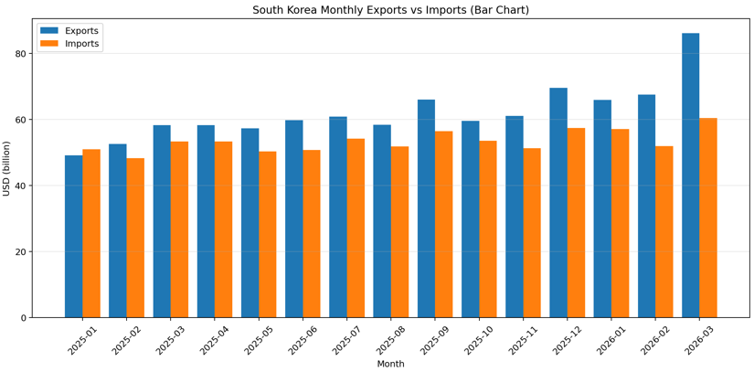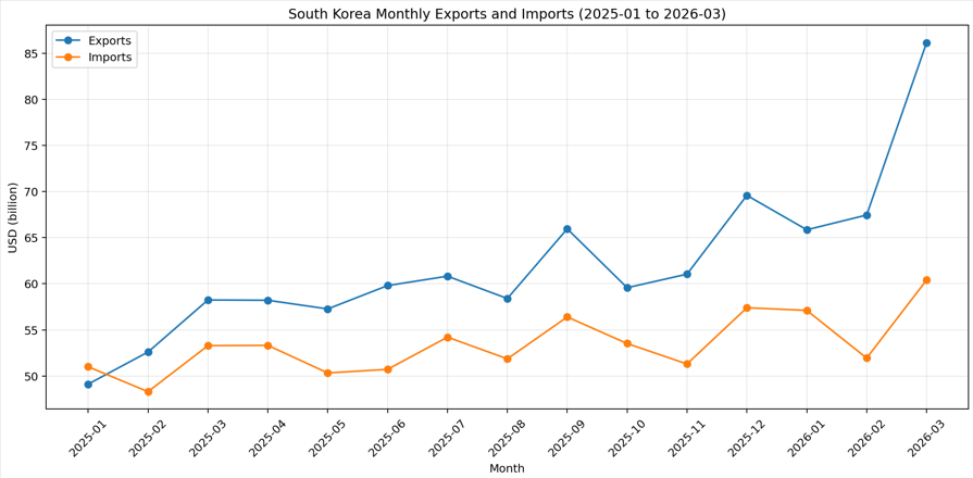 한국 기준 월별 수출·수입 그래프입니다. 단위는 10억 달러(USD billion) 입니다.